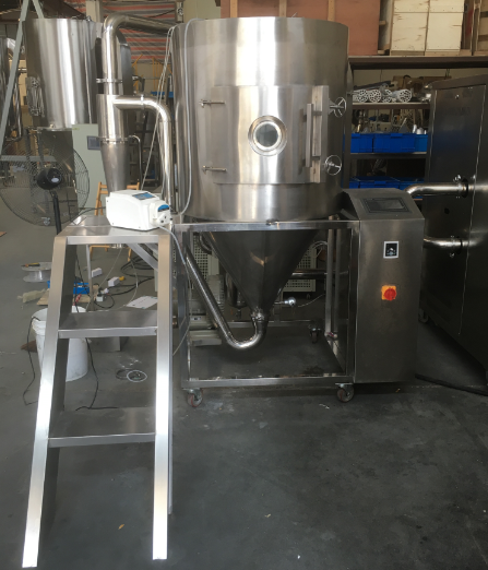 制備出真正的圓球狀實心微球顆粒,首選實驗可用上海歐蒙生產(chǎn)的OM-5000型實驗型噴霧干燥機。實驗型噴霧干燥機系統(tǒng)工作流程如圖所示。該系統(tǒng)的工作原理是空氣經(jīng)過電加熱以后,再通過高溫過濾器,以保證進人塔體的空氣是潔凈熱空氣,然后通過干燥室頂部的熱風分配器,通過熱風分配器的熱空氣均勻地進人干燥室內(nèi)并呈螺旋狀轉(zhuǎn)動,同時將料液送至離心噴霧頭。鋁礬土料漿被高速旋轉(zhuǎn)的噴霧頭噴射成球形霧滴,水分迅速在霧滴表面蒸發(fā),在極短的時間內(nèi),霧滴干燥收縮成為微球坯體。較粗的微球顆粒由干燥室底部的收集桶收集,較細的微球顆粒通過設(shè)在錐底的管道流到旋風分離器,并由套在旋風分離器底部的收集桶收集。廢氣通過除塵器排出。