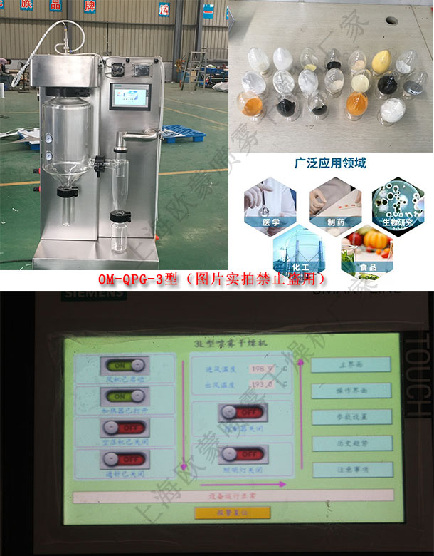 實驗室小型噴霧干燥機適用于高校、研究所和食品醫藥化工企業實驗室生產微量顆粒粉末,對所有溶液如乳濁液、懸浮液具有適用性, 適用于對熱敏感性物的干燥如生物制品、生物農藥、酶制劑等。因為所噴出的物料只是在噴成霧狀時才受到高溫且是瞬間受熱,故這些活性材料在干燥后仍維持其活性成份不變。